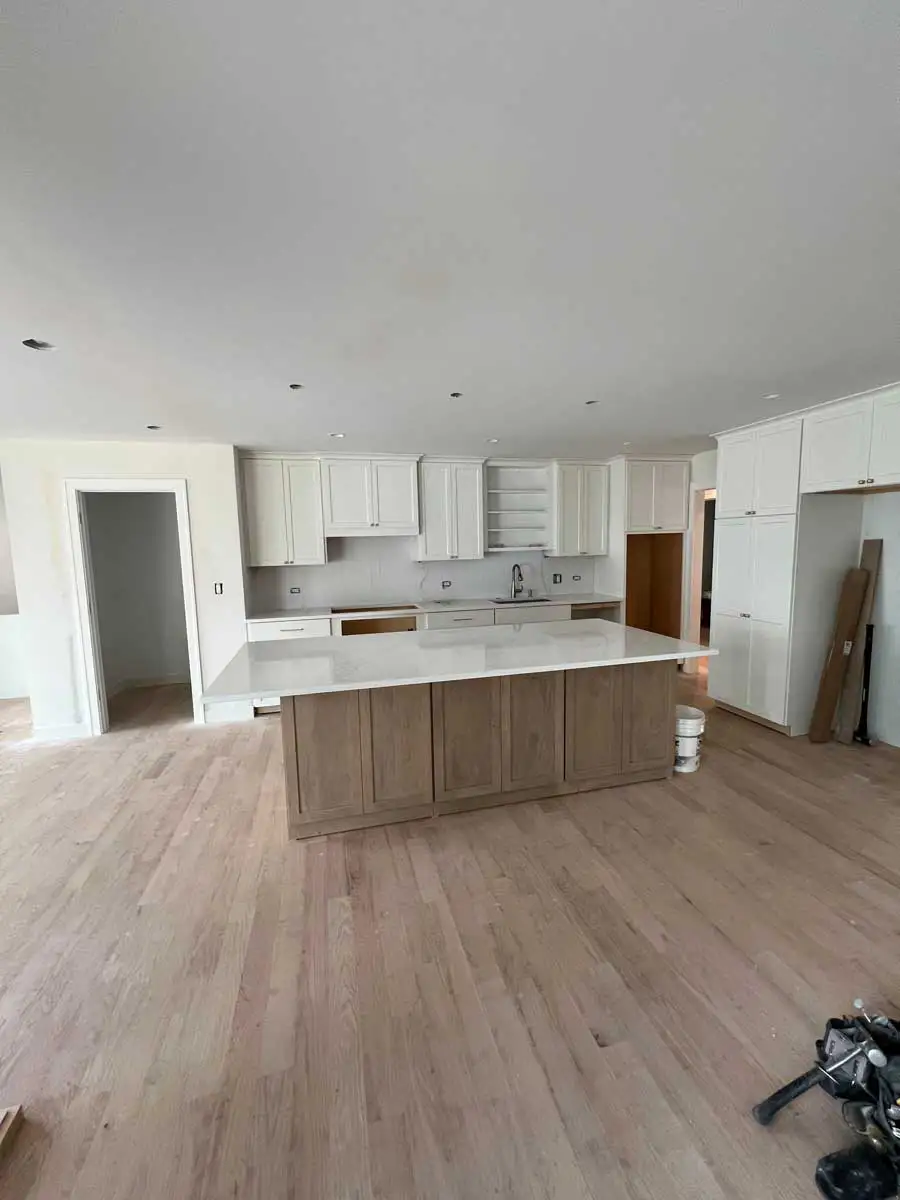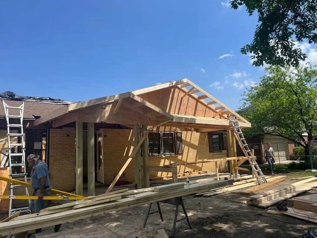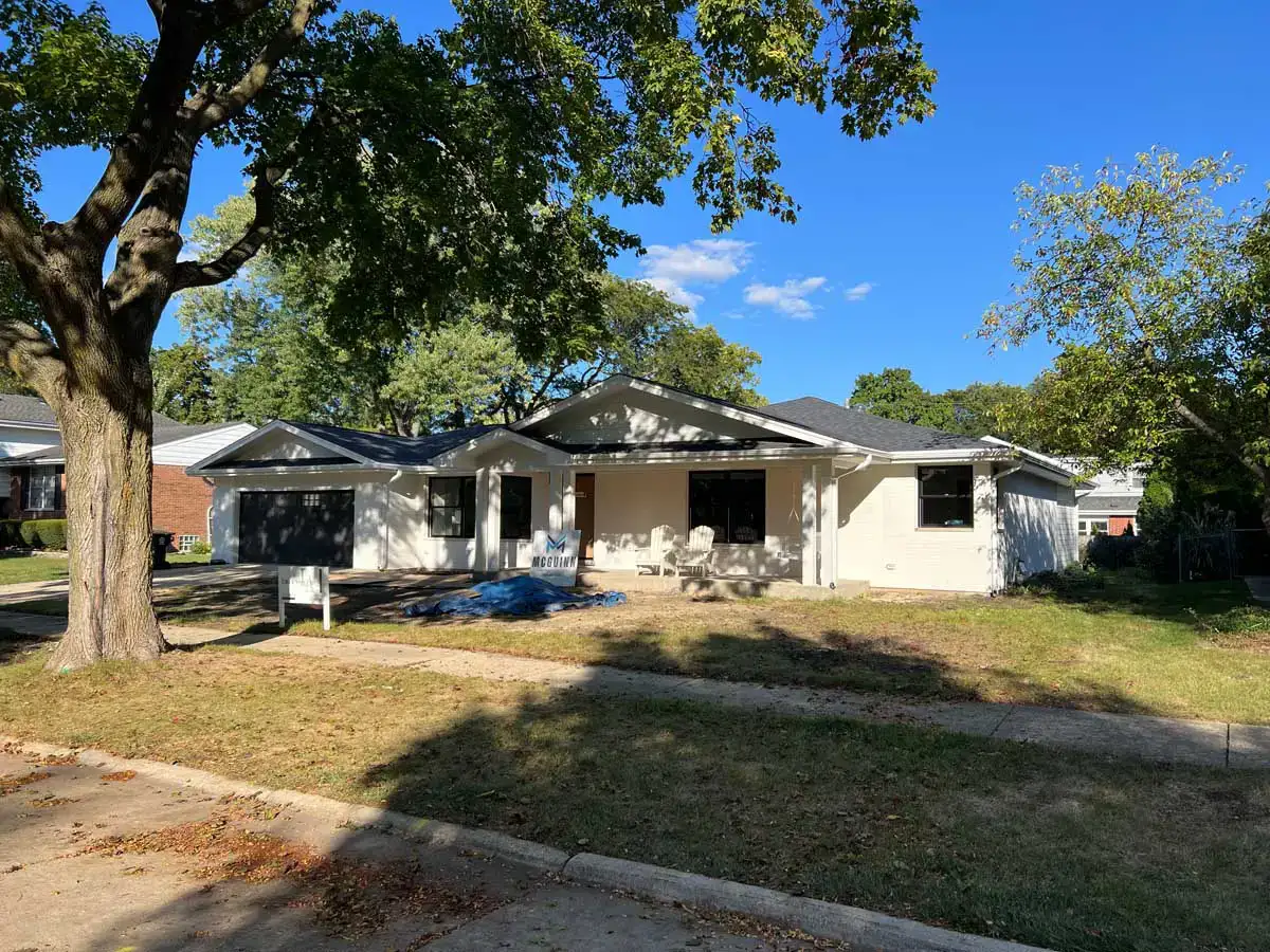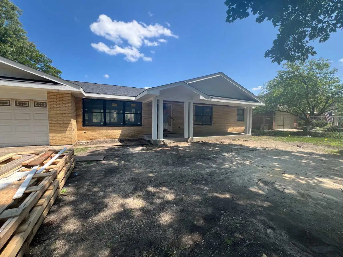 We removed the existing roof and added 750 SF of living space to the back of the house, completely reconfiguring the layout. The renovation included 2,000 SF of new wood flooring, two new bathrooms, a full kitchen remodel, a front porch addition, and two new roofline gables above the porch and garage. The exterior was updated with a new roof, windows, siding, and painted brick, creating a fully transformed home.