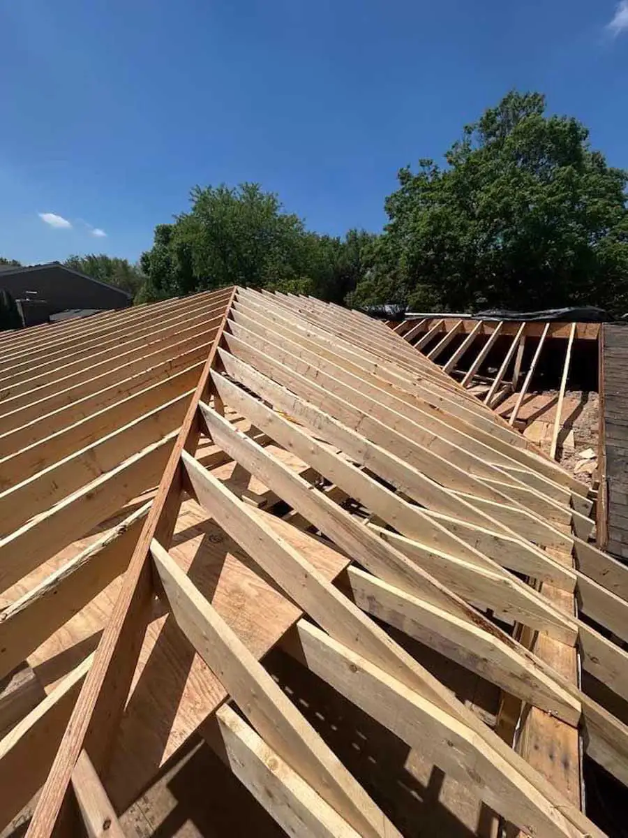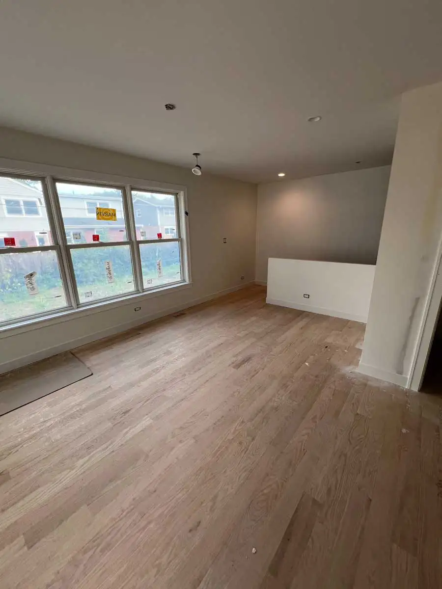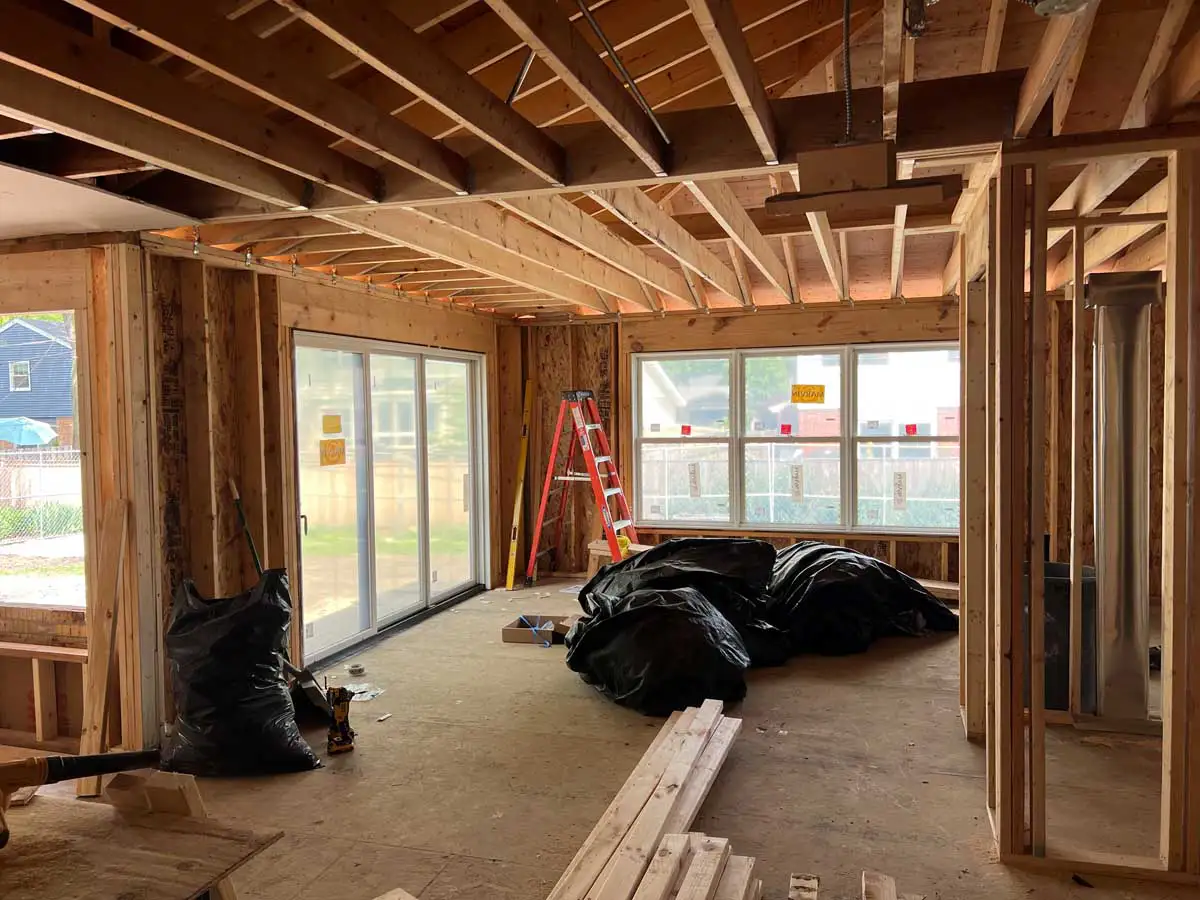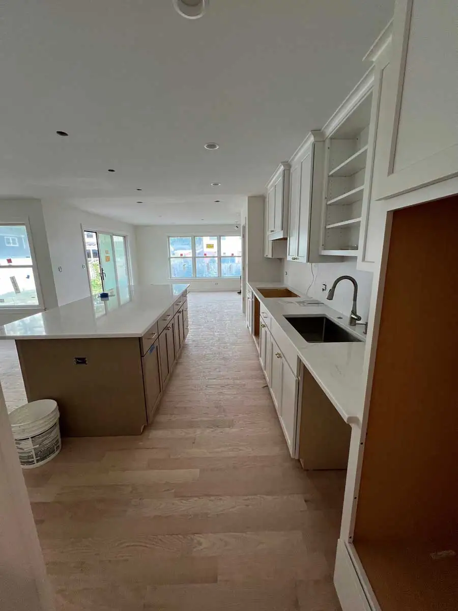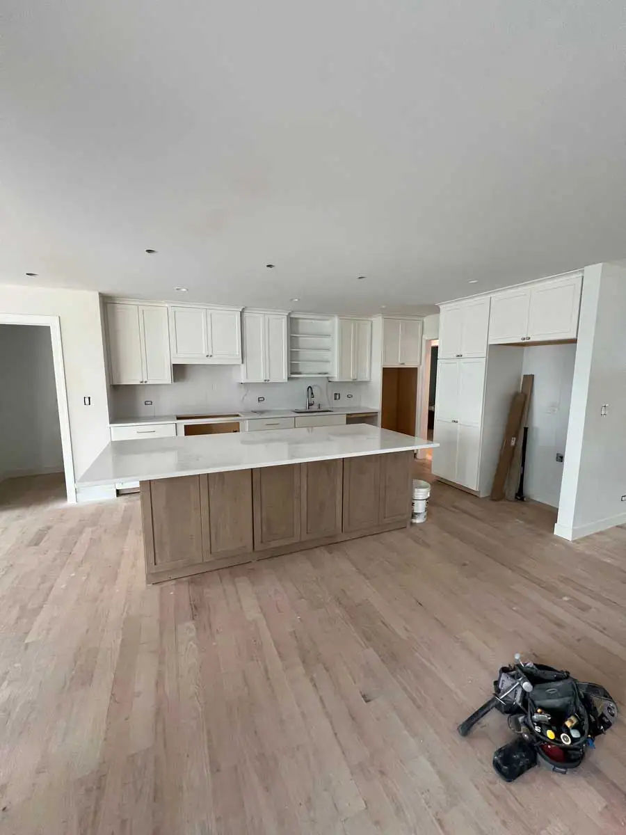 We removed the existing roof and added 750 SF of living space to the back of the house, completely reconfiguring the layout. The renovation included 2,000 SF of new wood flooring, two new bathrooms, a full kitchen remodel, a front porch addition, and two new roofline gables above the porch and garage. The exterior was updated with a new roof, windows, siding, and painted brick, creating a fully transformed home.